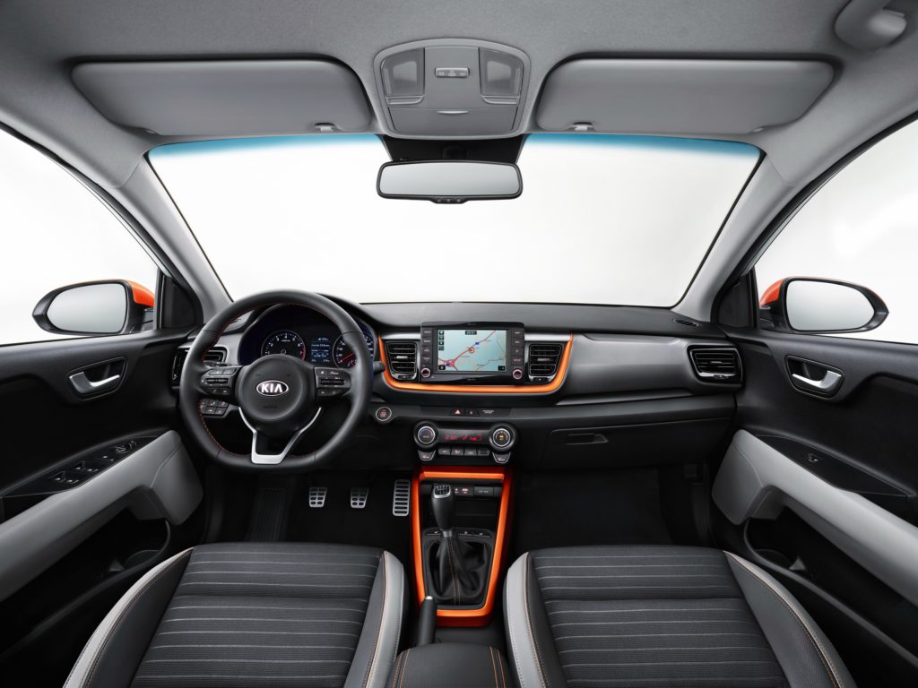 Салоном поделилась европейская версия пятидверки Kia Rio, но дизайнеры решили оживить знакомый интерьер яркими вставками — причем расцветка декоративных элементов, по всей видимости, зависит от того, в какой цвет выкрашена снаружи крыша кроссовера. (Да, снаружи машина будет двухцветной).
